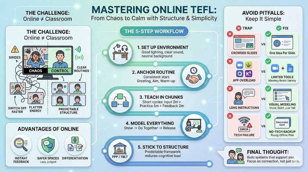 Don’t reinvent the wheel for every login. Pick a standard framework (like Presentation, Practice, Production). As mentioned in Lesson Planning for Language Teachers, a predictable structure drastically reduces your prep time. When you aren’t stressing about what comes next, you can focus on who is in front of you.
