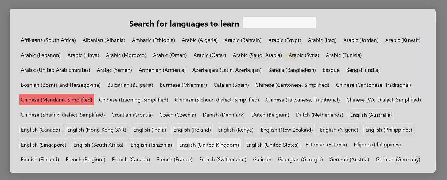 To test this, I selected ‘Chinese-Mandarin’ as I know the basics. The other greyed box is the language you speak - or the language your computer system is set to. Great for students working at home, with their computer set to their first language.