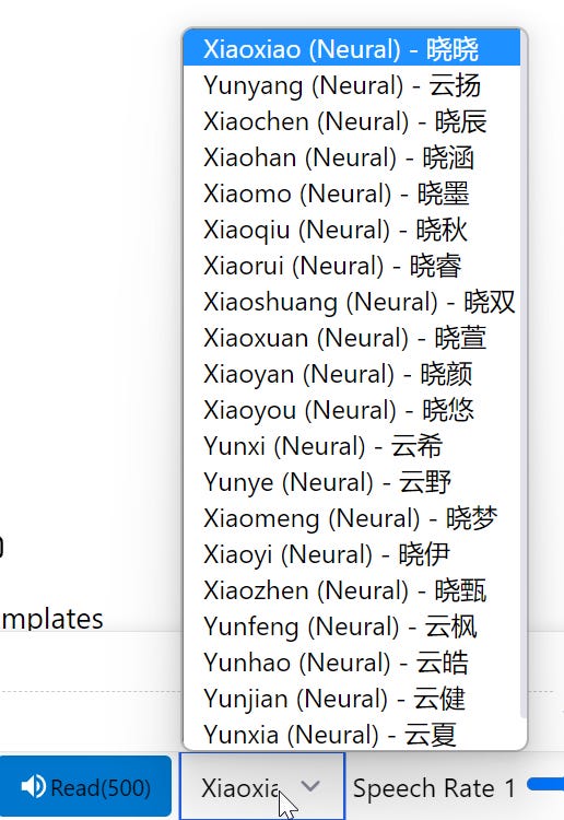 Name dropdown—you can select which voice you want to read aloud. This changes with each language. It uses a fantastic tool called a neural net to process speech, which means it sounds very natural (at least in Chinese, the language I’ve been testing!).