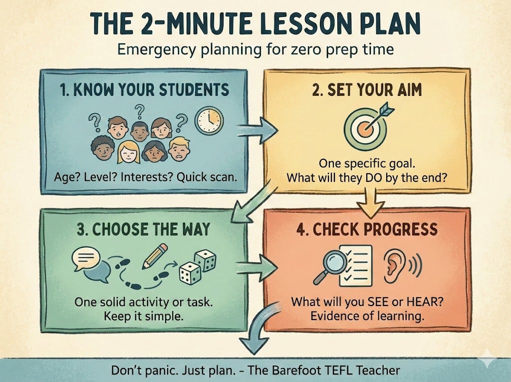 The 2-minute lesson plan is not a piece of paper you write down. It is a mental checklist you run through while walking to the classroom.